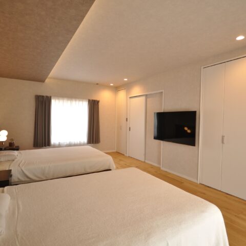 2階に2部屋あった和室を贅沢な広さの寝室に改装。壁面は全て収納で部屋の中はスッキリ。