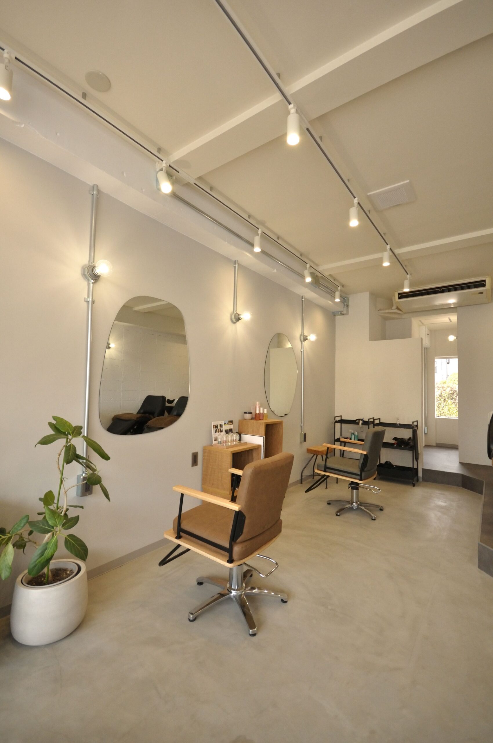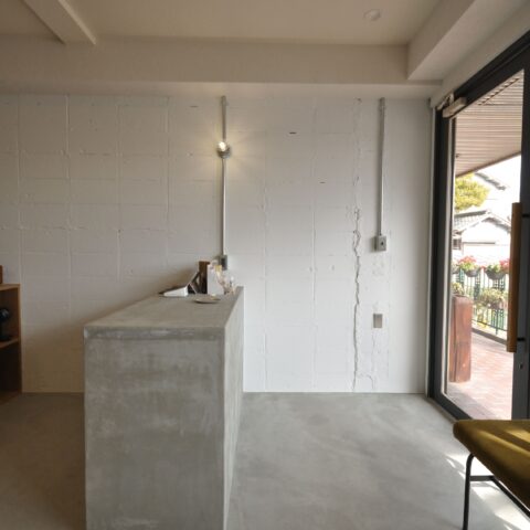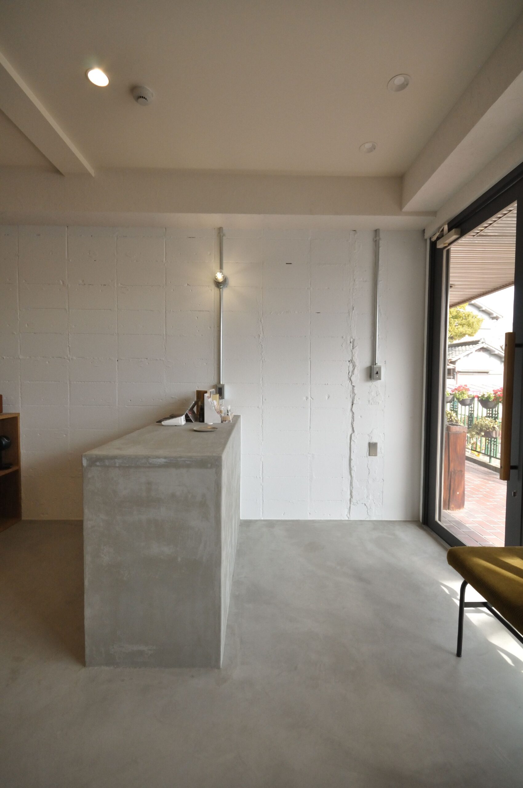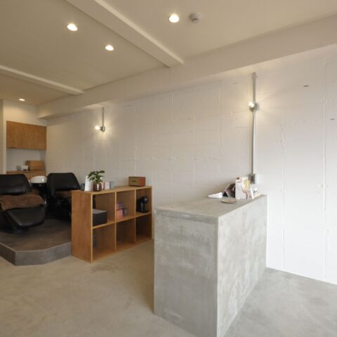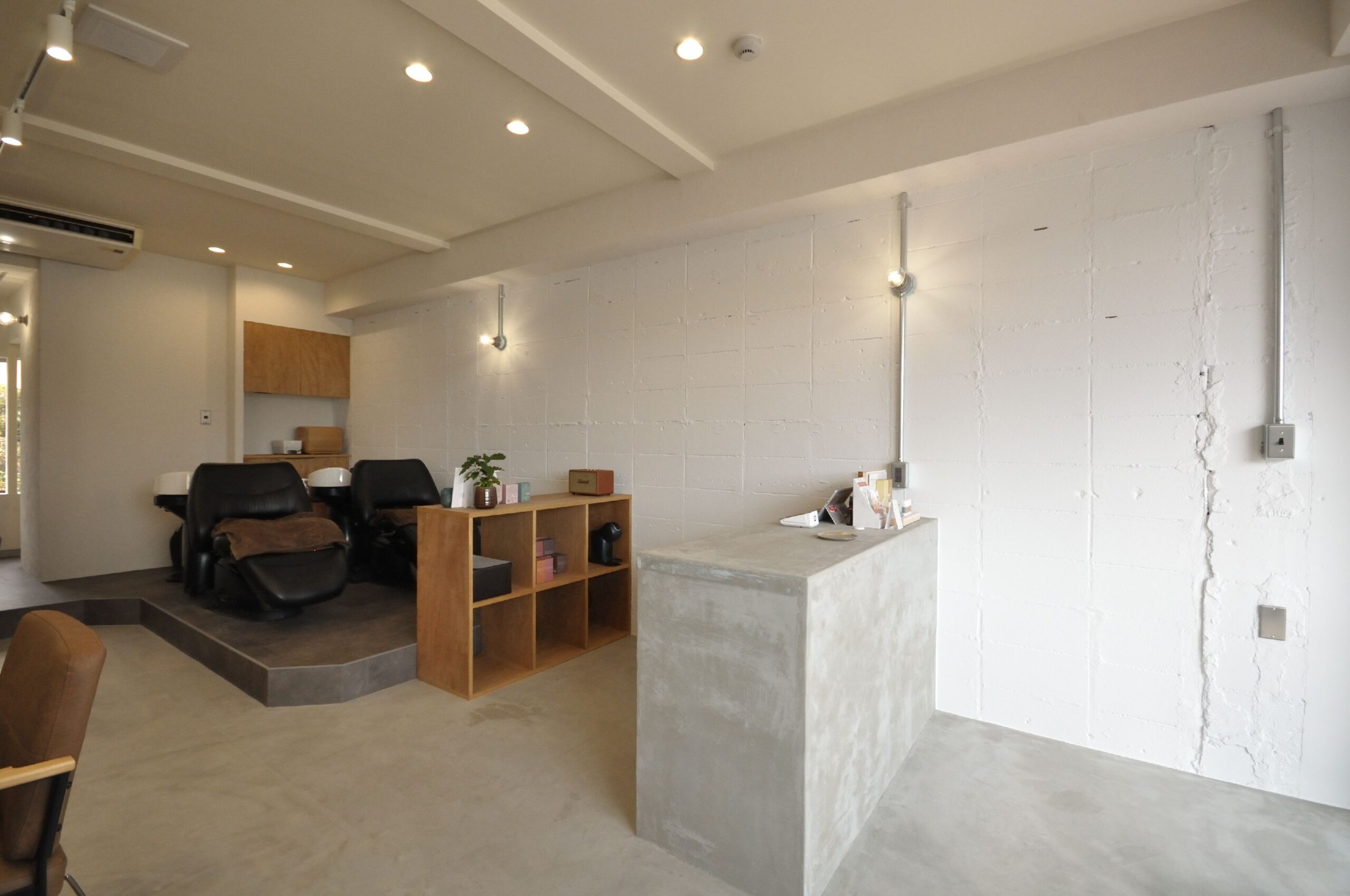 以前ご自宅を工事させて頂いたお客様が独立開業されるとのことで、プライベートサロンを作るお手伝いをさせて頂きました。 限られた空間の中で、明るく広々と使える様、配置や使用する素材等お打合せをさせて頂きました。 隣との境界の壁になっているブロック塀はそのまま活かして白く塗装。あえて鉄管を使用した照明たち。モルタル仕上げのレジカウンター。自由に組み替えが出来る造作の飾り棚。たくさんのこだわりが詰まった素敵なプライベートサロンが出来上がりました。