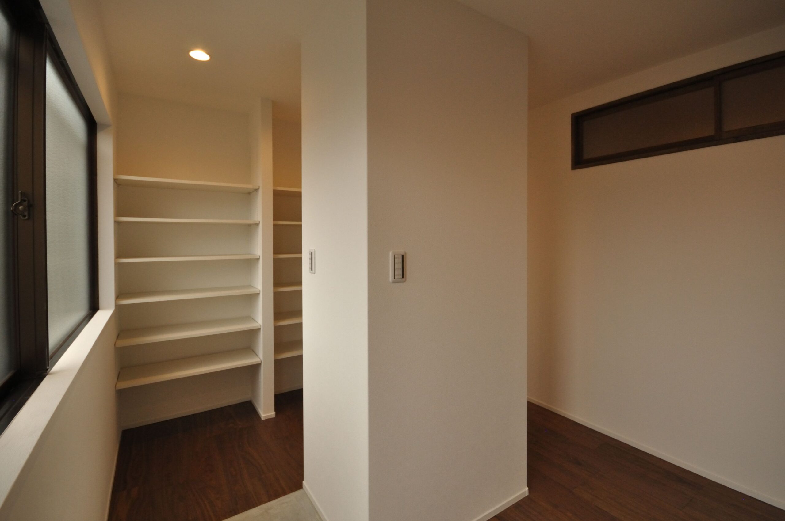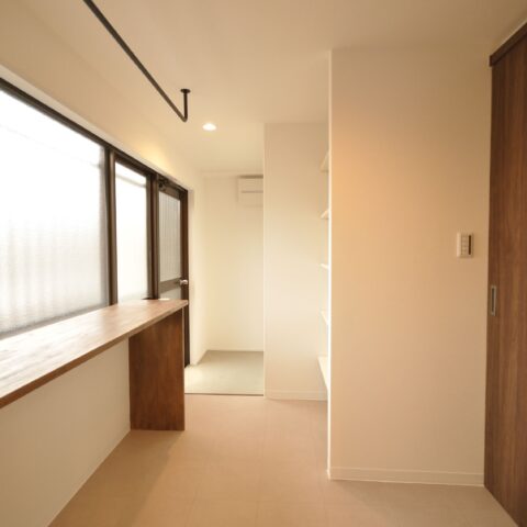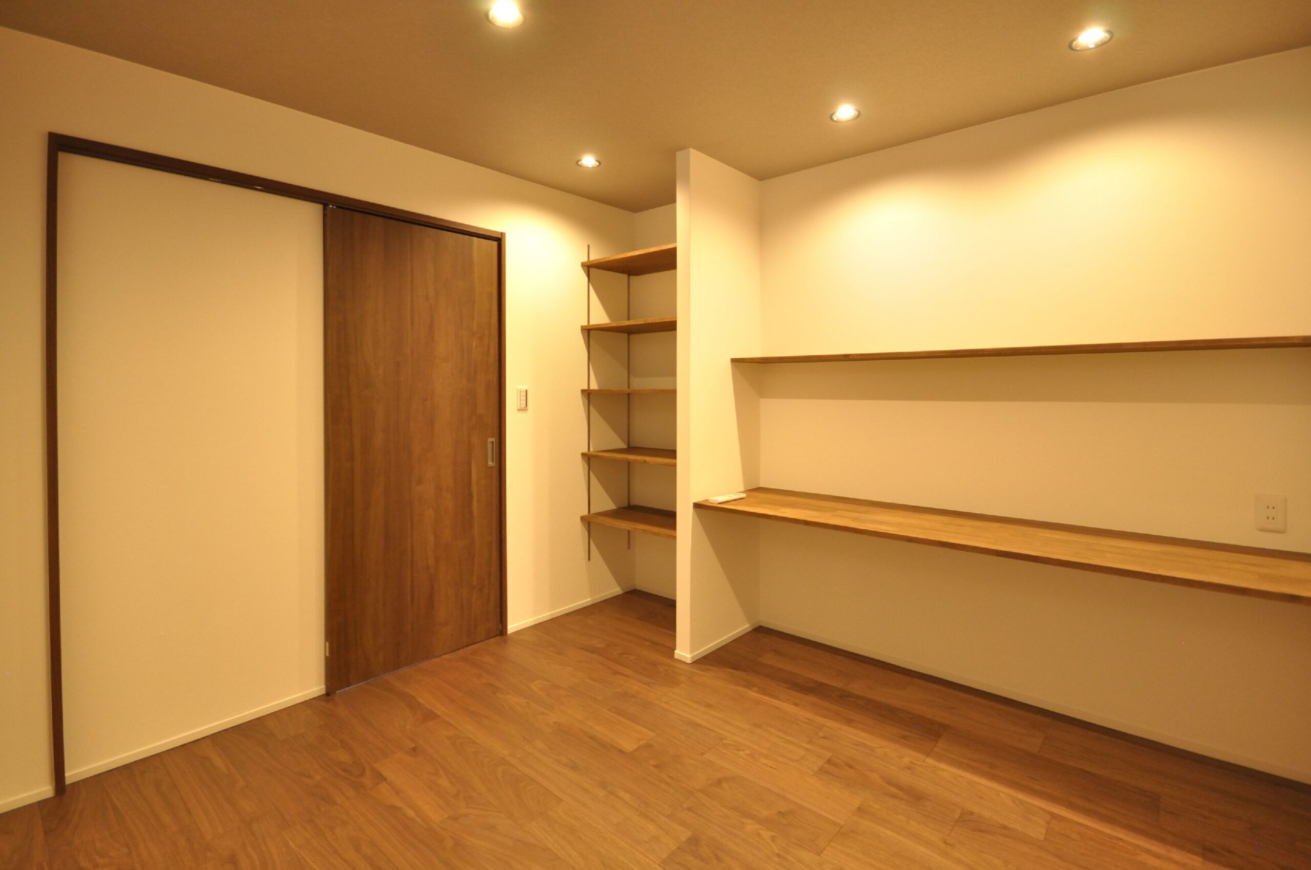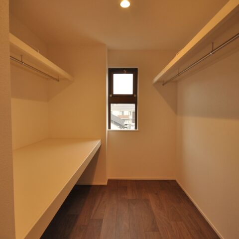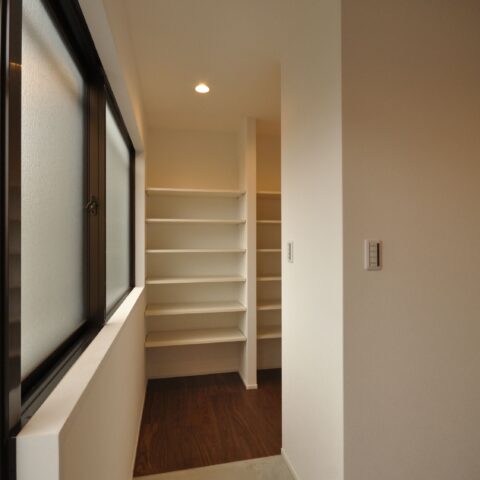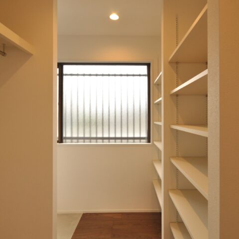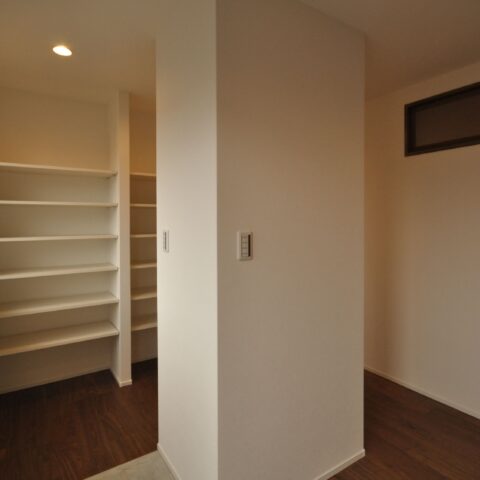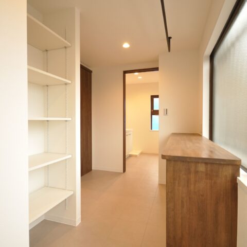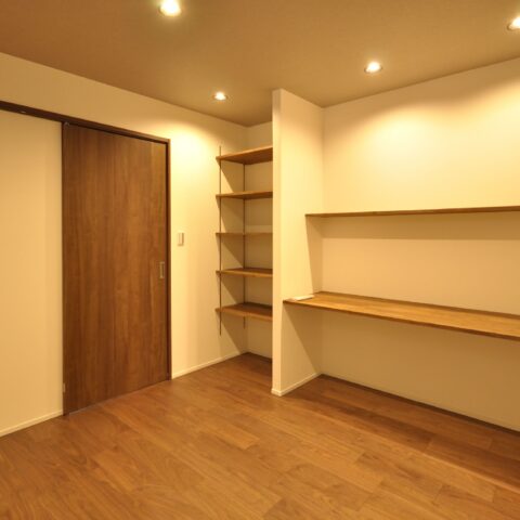 寝室には仕事でも使える広々としたデスクと収納を設置しました。収納にもこだわり、玄関横のシューズクローゼットや、家族の衣服や布団も収納出来る大容量のファミリークローゼット、キッチンの後ろの扉を開けると、パントリー兼ランドリースペースもあります。