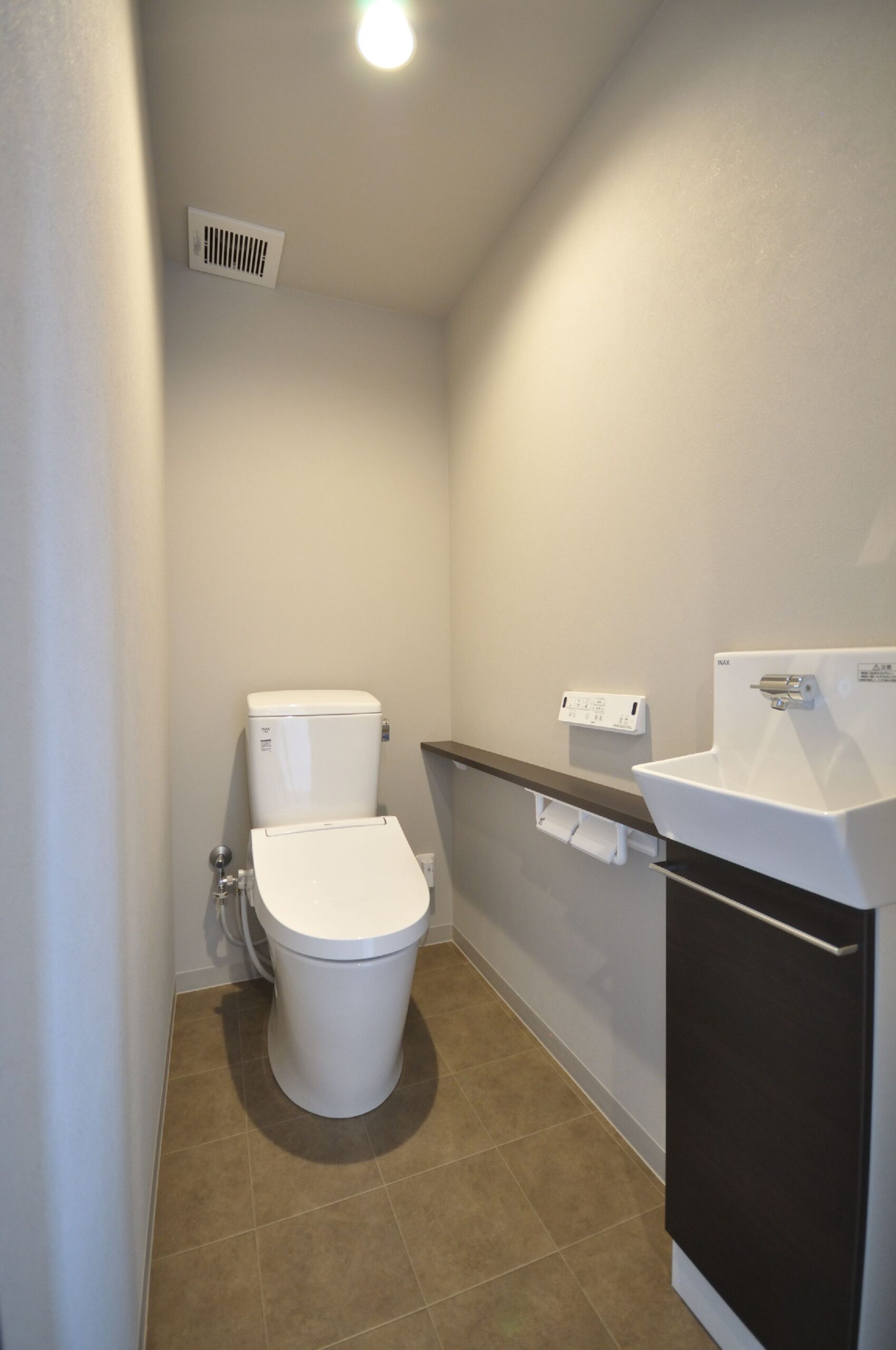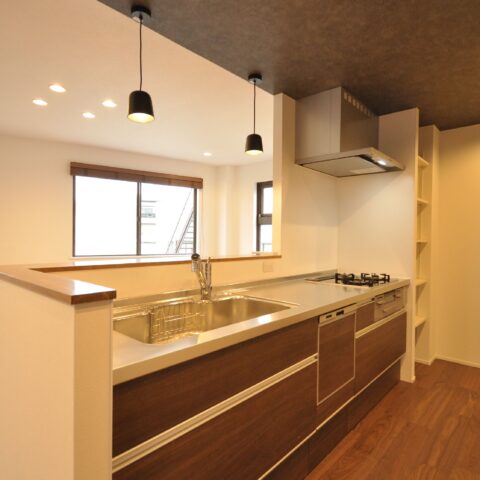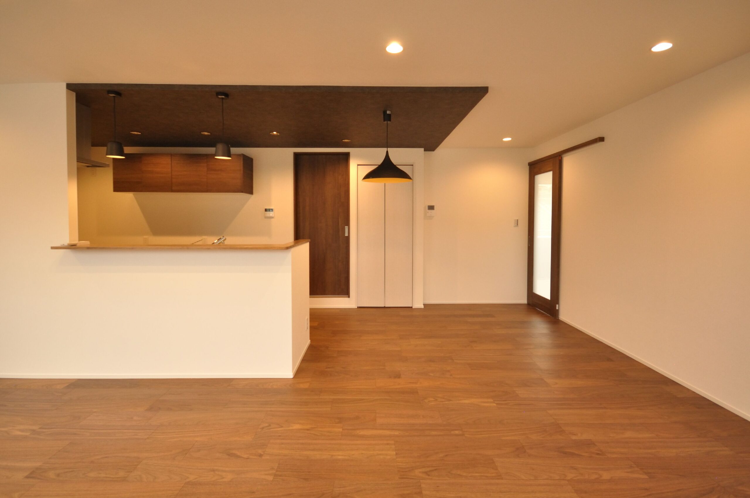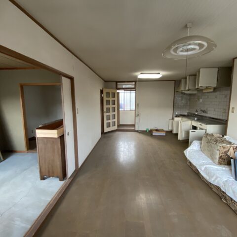 元々賃貸として貸し出していた2部屋を1つの住居にリノベーションさせて頂きました。天井、床、壁、全てを解体し、間取り変更を経て、広々としたLDKと収納もたっぷりあるワンフロアの素敵なお家になりました。白を基調とし、落ち着いたウォールナット色でまとめた、大人の落ち着いた雰囲気です。